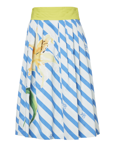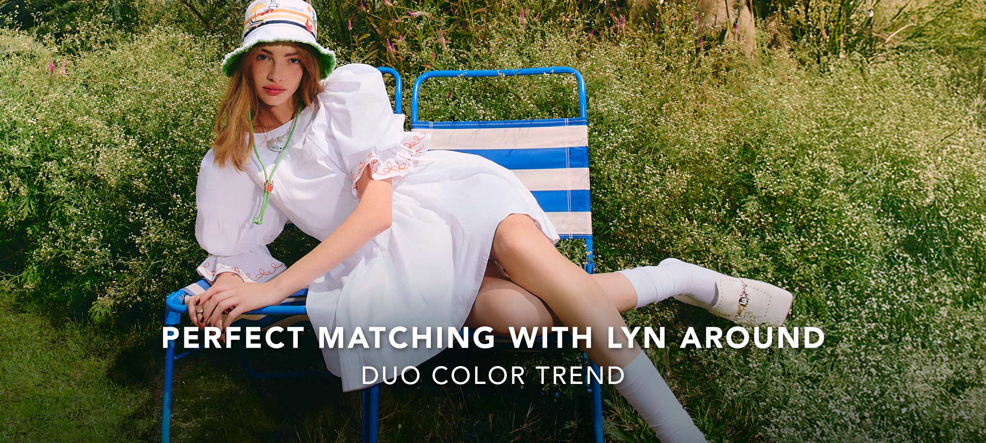 The Lyn around collection shown in the images emphasizes two-tone clothing that stands out with perfectly balanced color combinations. Particularly striking is the light blue shirt paired with a blue-and-white striped skirt and yellowish green belt, creating a perfectly color-matched chic look that feels fresh and distinctive.